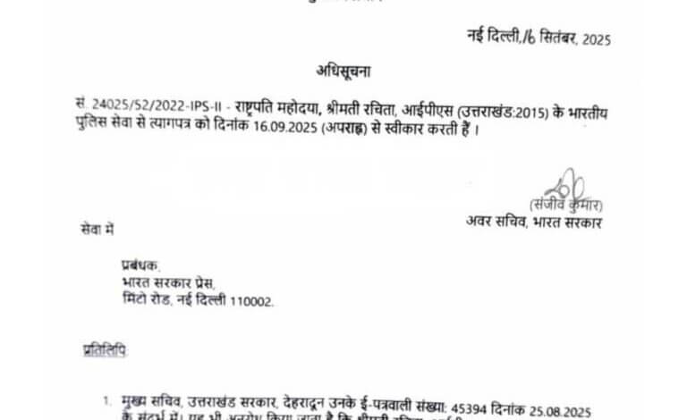 उत्तराखंड सरकार के मुख्य सचिव ने भी 25 अगस्त 2025 को रचिता के इस्तीफे से संबंधित प्रस्ताव केंद्र को भेजा था। इसके बाद गृह मंत्रालय ने अधिसूचना जारी कर दी।