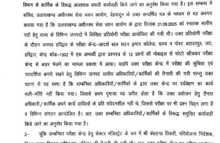 उत्तराखंड अधीनस्थ सेवा चयन आयोग (यूकेएसएसएससी) की स्नातक स्तर की कराई गई परीक्षा में पेपर लीक के मामले में सरकार ने एक बड़ा फैसला लिया है। आदर्श बाल सदन इंटर कॉलेज, बहादरपुर जट में ड्यूटी पर तैनात सेक्टर मजिस्ट्रेट के.एन. तिवारी को ड्यूटी में लापरवाही का दोषी पाया गया है। तिवारी, जो जिला ग्राम्य विकास अभिकरण हरिद्वार में परियोजना निदेशक के पद पर कार्यरत है। प्रथम दृष्टया जिम्मेदार मानते हुए निलंबित कर दिया गया है।